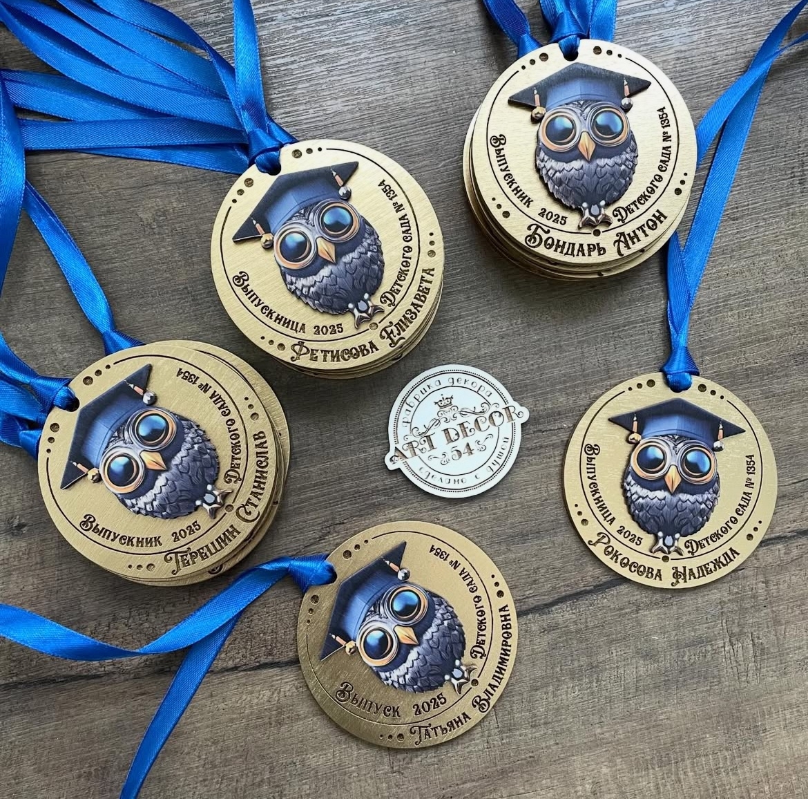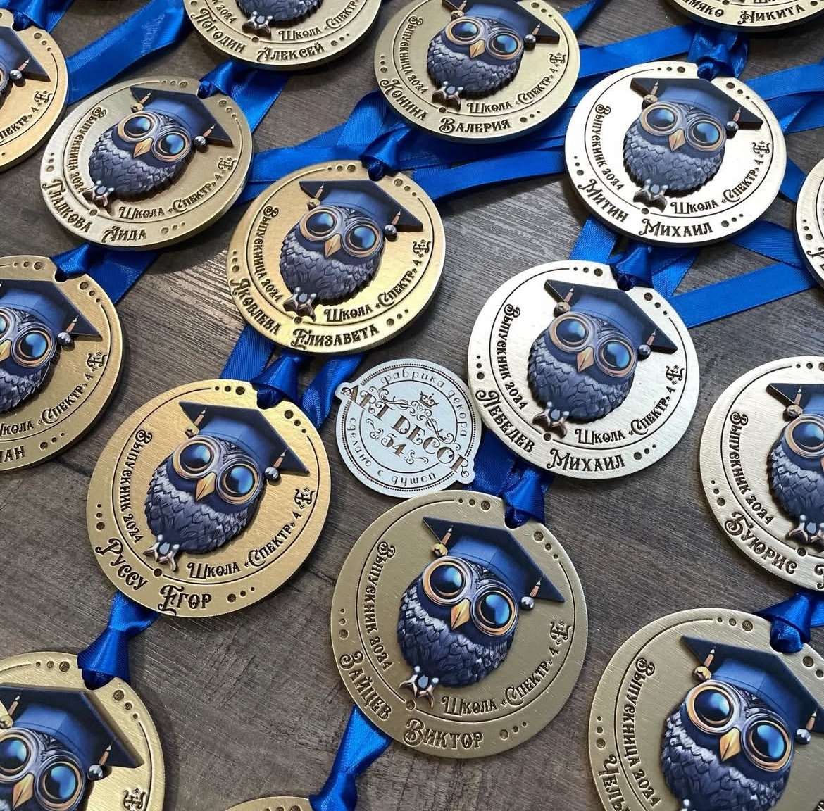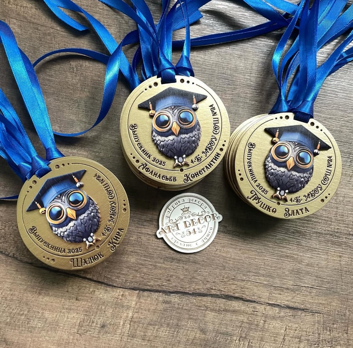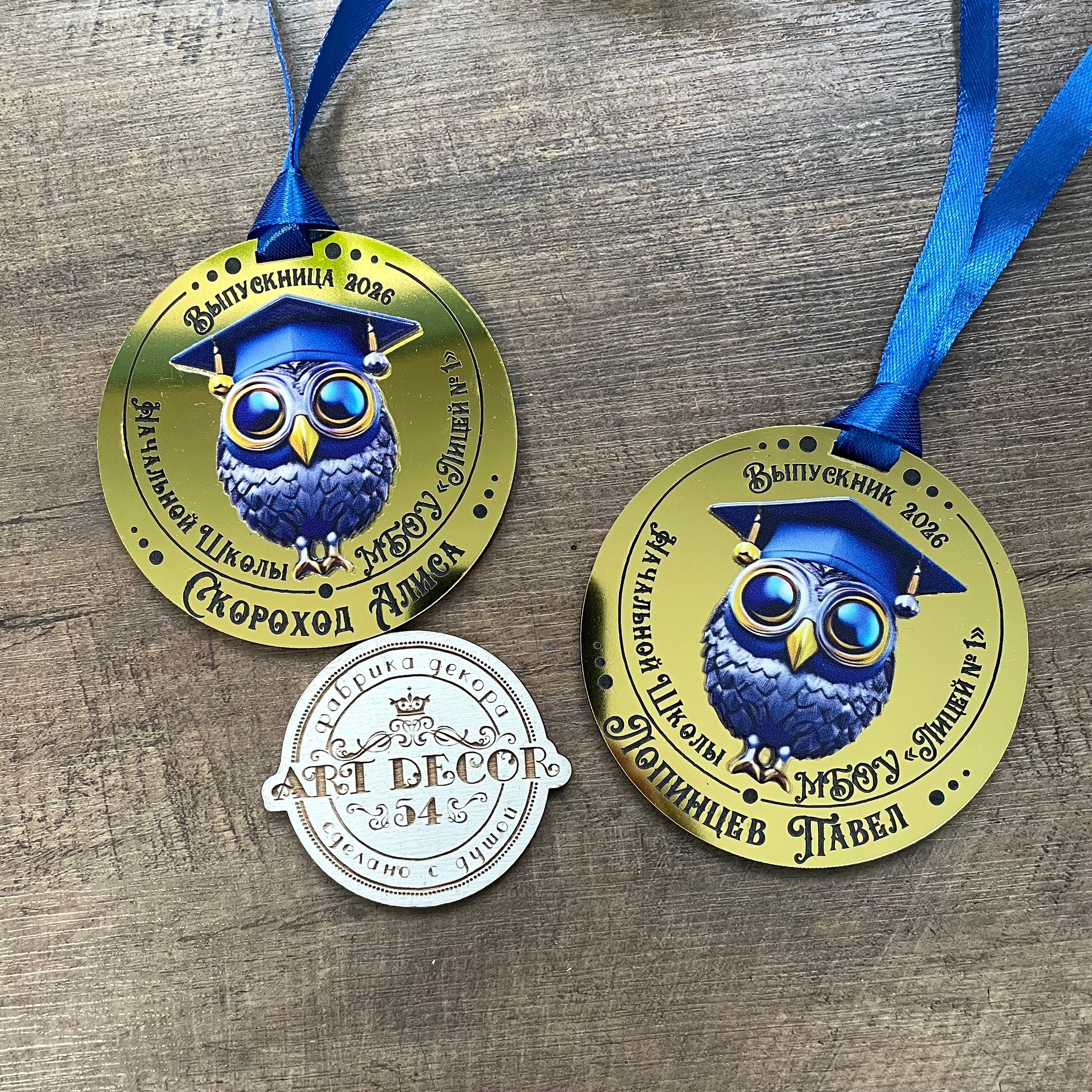 Именная медаль «Сова» синяя/розовая с нецветными глазами