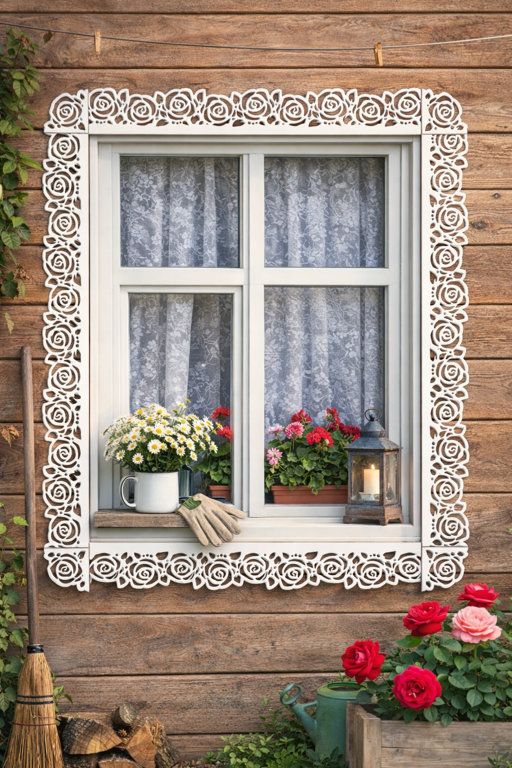 Набор можно собрать в разных вариантах на окно, посмотреть примеры можно на фото. Также его можно закрепить на карниз, что будет выглядеть как причелины.